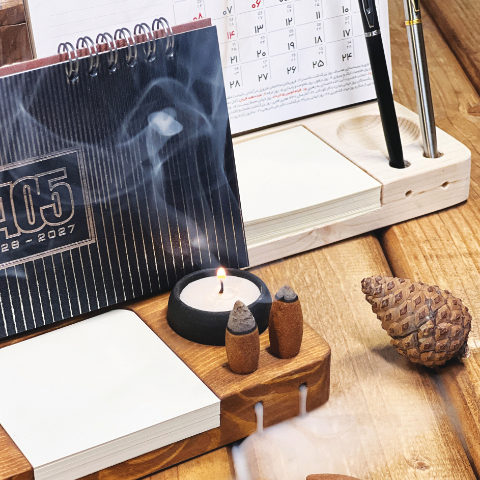 پایه چوبی, مقوای سوزنی 250 گرم، برگ اول متالایز نقره کوب, جا سوزنی، جا خودکار، جا عودی، جا یادداشت و جاشمعی، همراه با جعبه, با قابلیت نصب پلاک ، لیزر Co2 یا لیبل UV- DTF