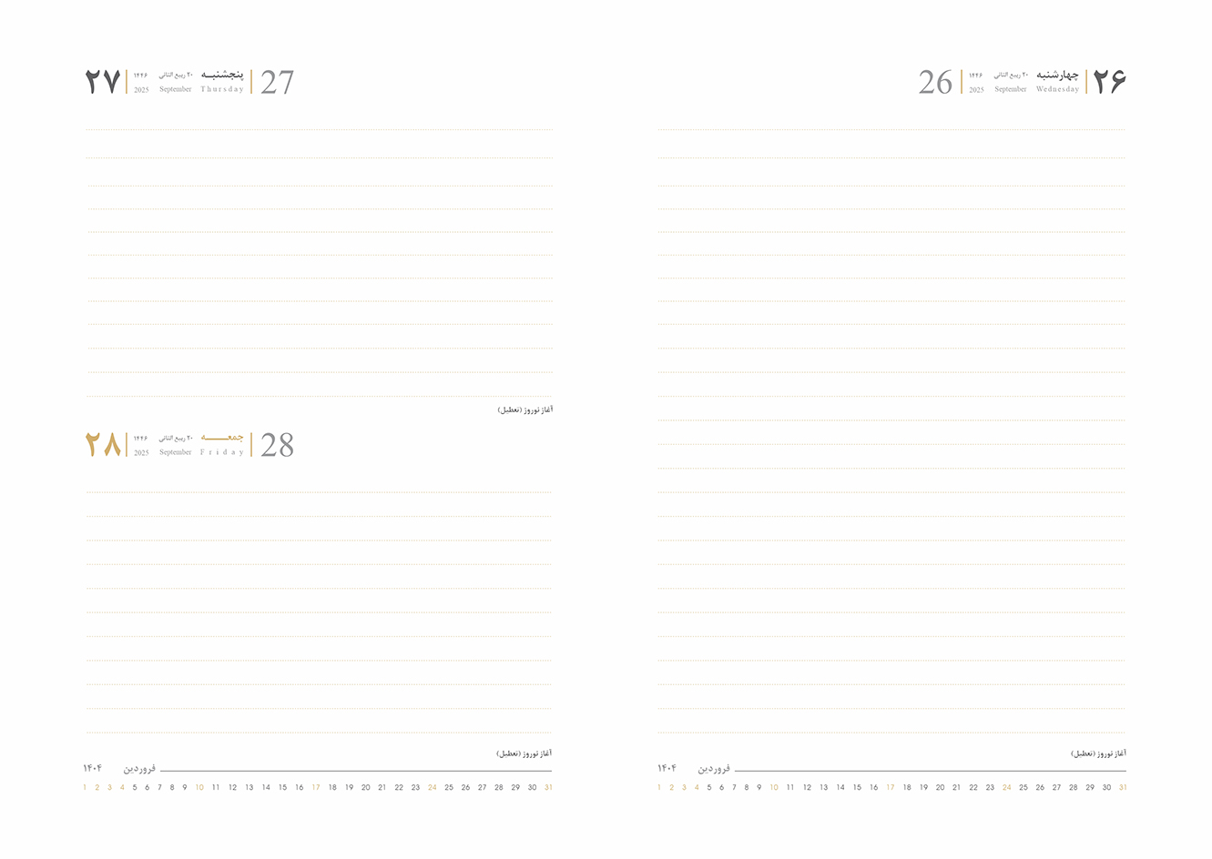 رنگ زیبای روی جلد چرمیاش، در کنار رنگ لبهی صفحات، جلوهای خاص برایش ایجاد کرده است. روی جلد این سررسید وزیری، یک پلاک فلزی قرار دارد که میتواند با نشان برندتان تزیین شود. نوار بلند بین صفحات، کار را برای نشانهگذاری آسان میکند. این سررسید با استفاده از یک کش محکم بسته میشود و مثل یک بستهی کامل قابل حمل است. از دیگر ویژگیهای این محصول، میتوان به کیفیت بالای کاغذهای آن اشاره کرد. این تقویم وزن کمی ندارد اما با توجه به ظاهر زیبایش، هدیهی خوبی برای تبلیغ شرکتها و معرفی برند میتواند باشد. اگر به محصولی نیاز دارید که بتوانید با استفاده از آن کارهای روزانتان را یاداشت کنید و همچنین تاریخشمار مناسبی برای شما باشد، این سررسید را به شما توصیه میکنیم.